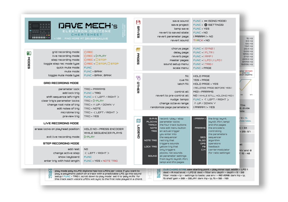 A completely newly designed cheat sheet for Digitone (original)! It contains an enormous amount of information ranging from key shortcuts to sound design tips. You get two versions. One is better suited for on screen (i version) and the other is nice to print to paper (p version).
