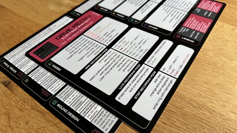 Here it is, a beautifully designed print edition of the Syntakt cheatsheet! Even more unique design than the digital versions with its black borders. It's made from a very durable plastic that is both tear and spill proof. The size of the sheet is A4.